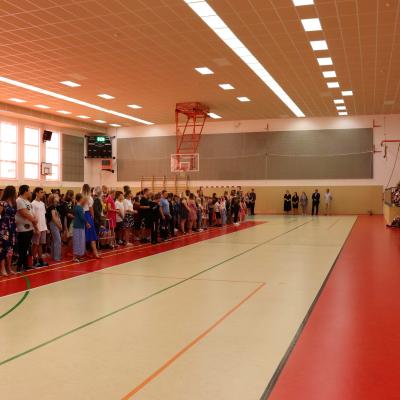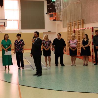 Zahájení školního roku proběhlo ve sportovní hale. Žáky všech tříd, kteří nastoupili na plochu, přivítalo vedení školy, pan starosta Martin Ernst, předsedkyně Školské rady a spolku POŠ Jana Oulehlová a pan farář Tomáš Strogan. Zvláštní pozornost byla věnována našim prvňáčkům, kteří slavnostní shromáždění sledovali z tribuny se svými rodiči.