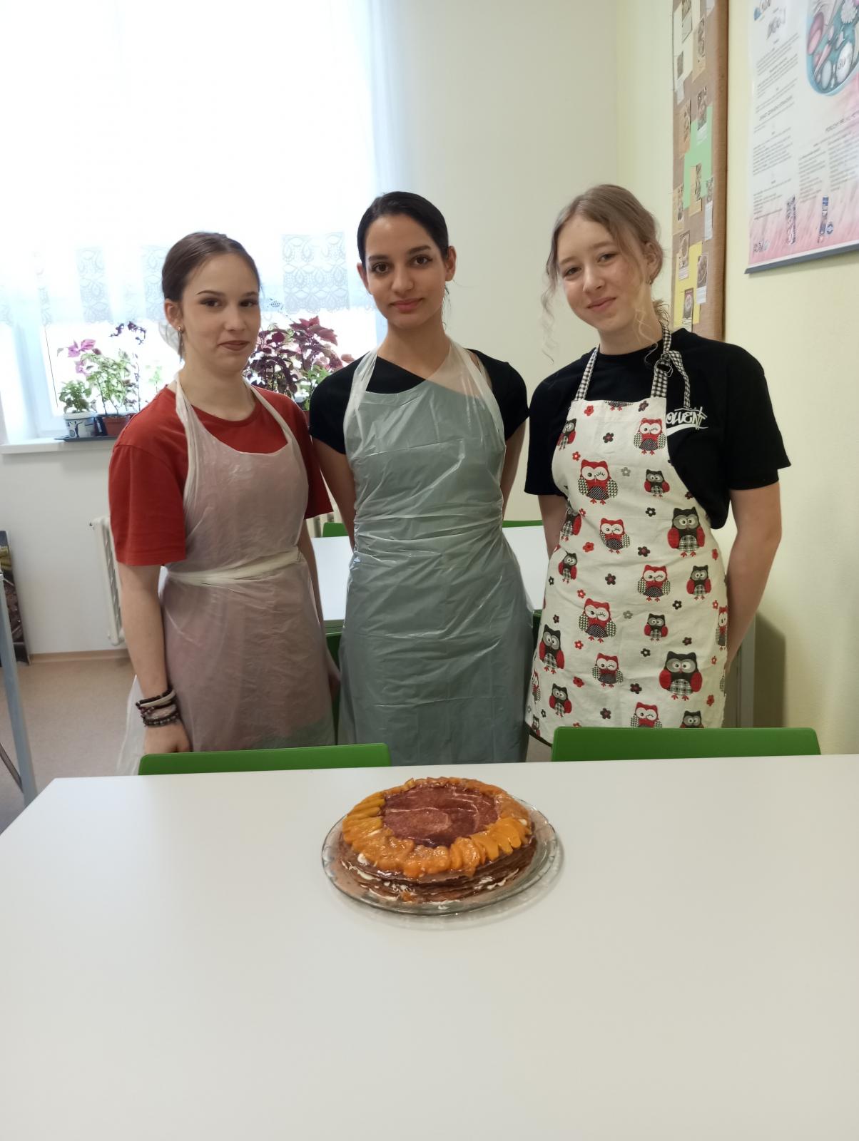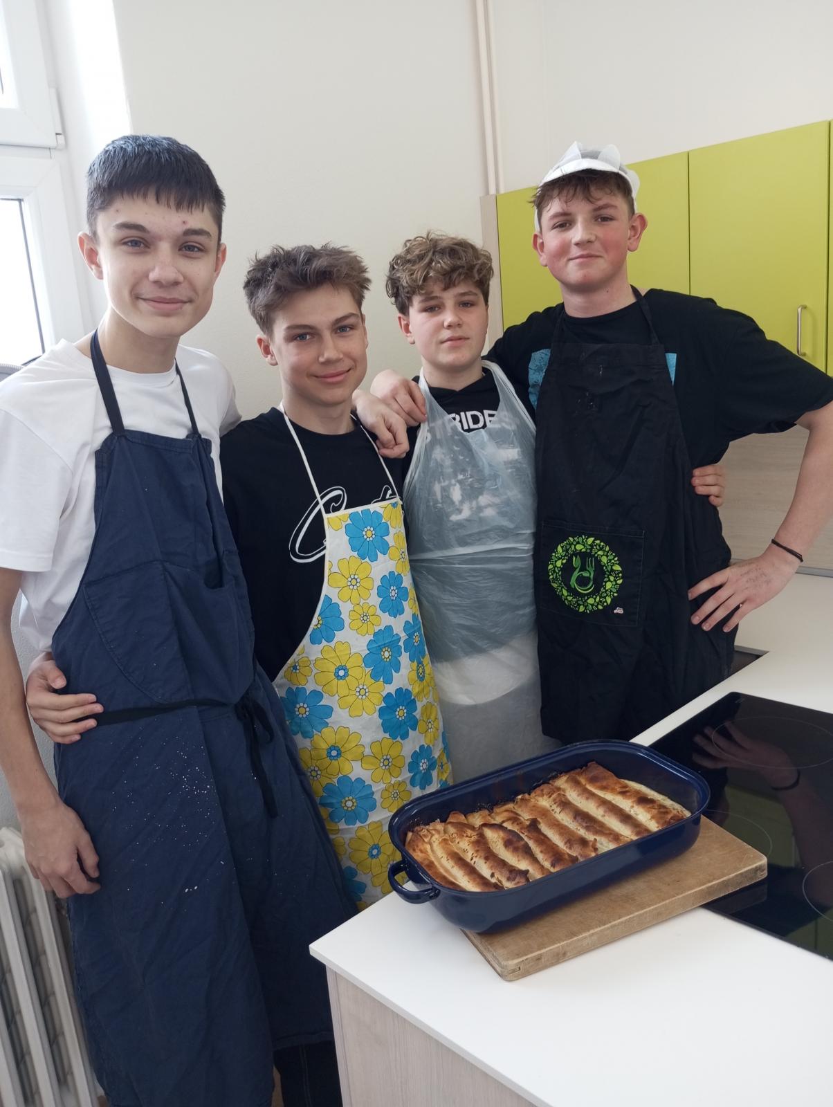V období masopustního veselí se žáci devátého ročníku rozhodli, že místo tradičních smažených koblih si v hodině Vedení domácnosti připraví pokrmy z palačinek. Dvě skupinky připravené palačinky naplnily marmeládou a tvarohem, vyskládaly do zapékací mísy a daly zapéct s vanilkovou zálivkou do trouby. Třetí skupinka připravila kakaové palačinky a pak je plnila nutellou a krémem z mascarpone a skládala do dortu. Na závěr dort ozdobila ovocem. Vůně se linula celou školou a spousta zvědavců nakukovala do školní kuchyňky. V závěru hodiny žáci vše zkonzumovali do posledního drobečku.