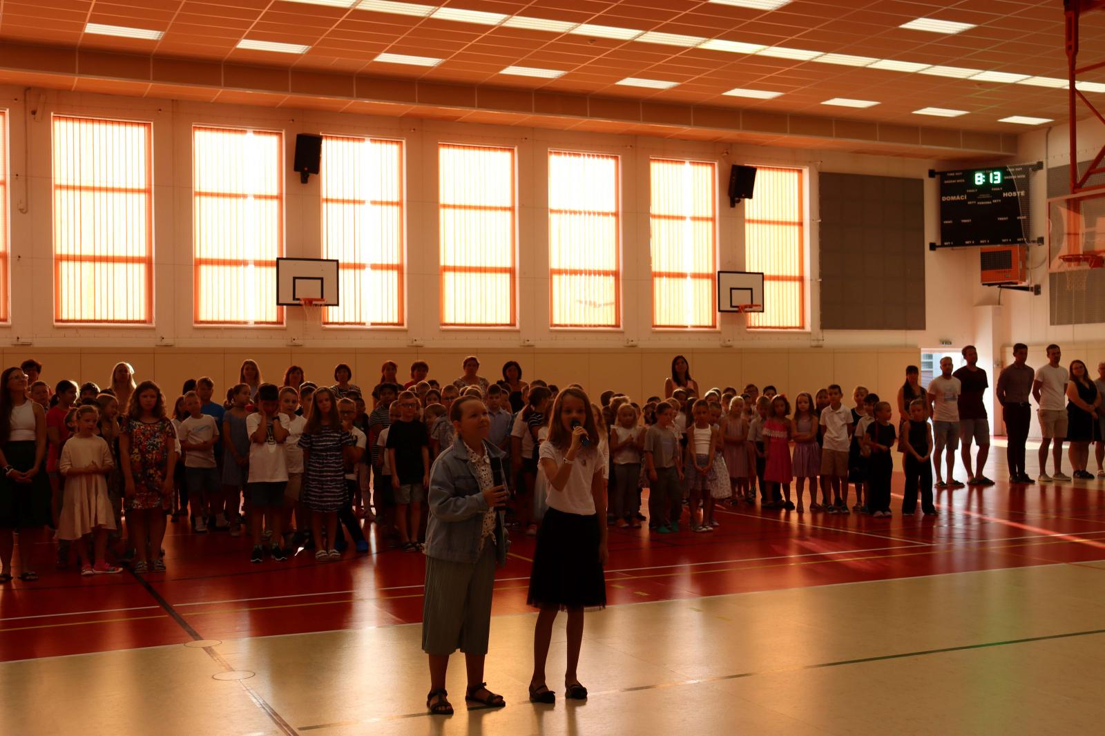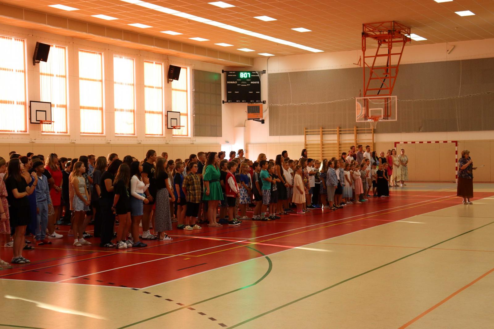 Školní rok začal pro žáky naší školy 2. září tradičním shromážděním ve sportovní hale. Paní ředitelka přivítala děti, které se vrátily po prázdninách a představila všem nové učitele a asistentky pedagoga. Zvlášť významný byl tento den pro naše malé prvňáčky, kteří spolu se svými rodiči sledovali zahájení školního roku z divácké tribuny. Letos jich k nám nastoupil rekordní počet-53, takže po dlouhé době otevíráme 3 první třídy.