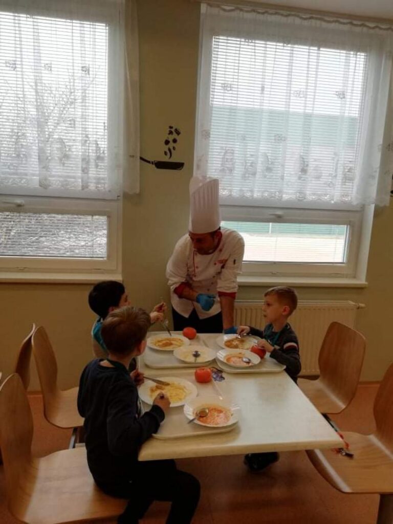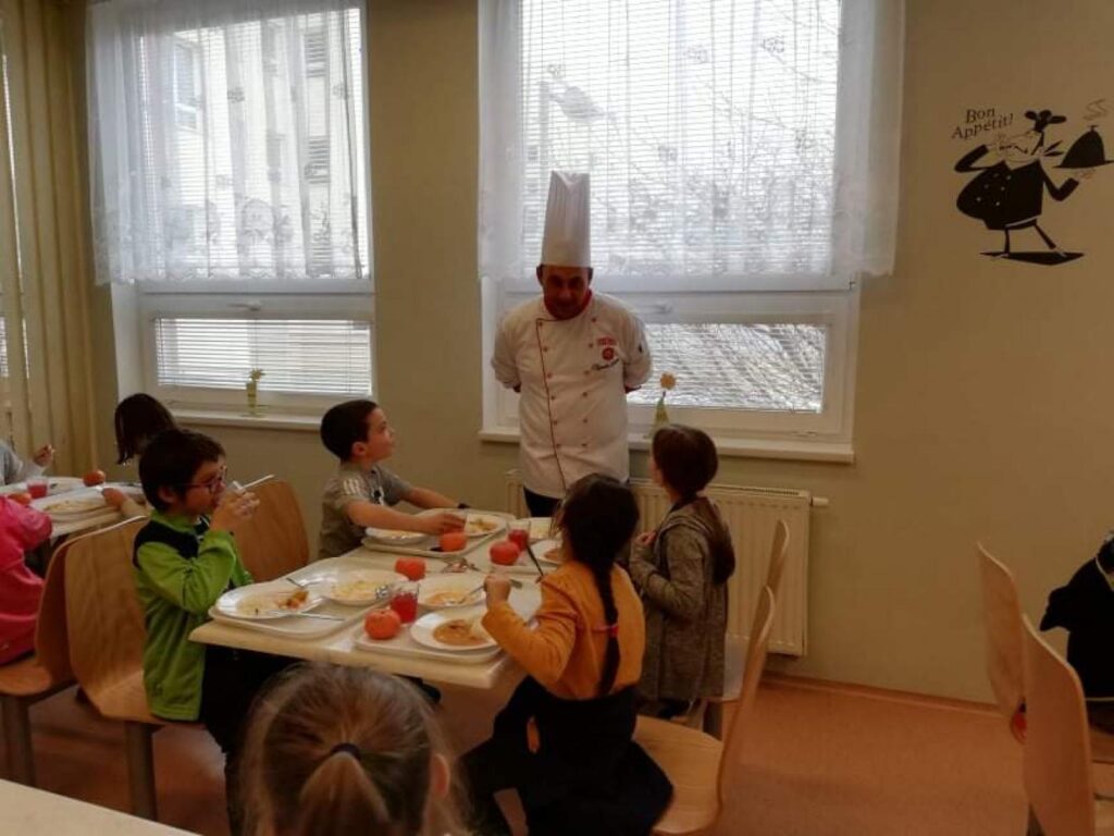 Ve středu 16. 3. 2022 k nám přijel uvařit šéfkuchař Zbyněk Diatka. Žáci a zaměstnanci naší školy si mohli pochutnat na čočkové polévce s rajčaty a tymiánem a jako hlavní chod připravil šéfkuchař africké kuřecí kari – kuku paka. Všichni strávnici měli možnost poznat nové světové chutě.